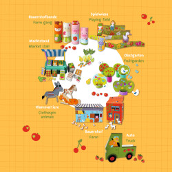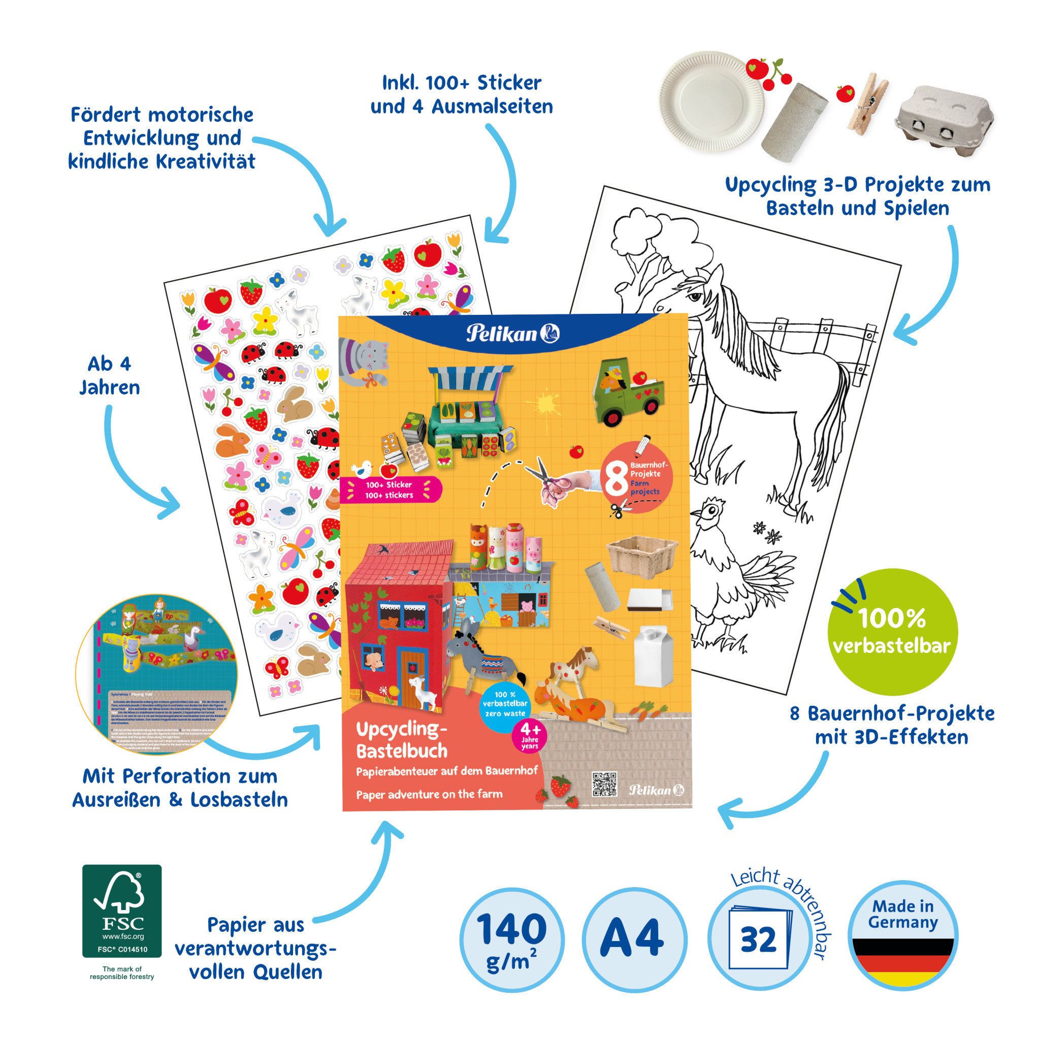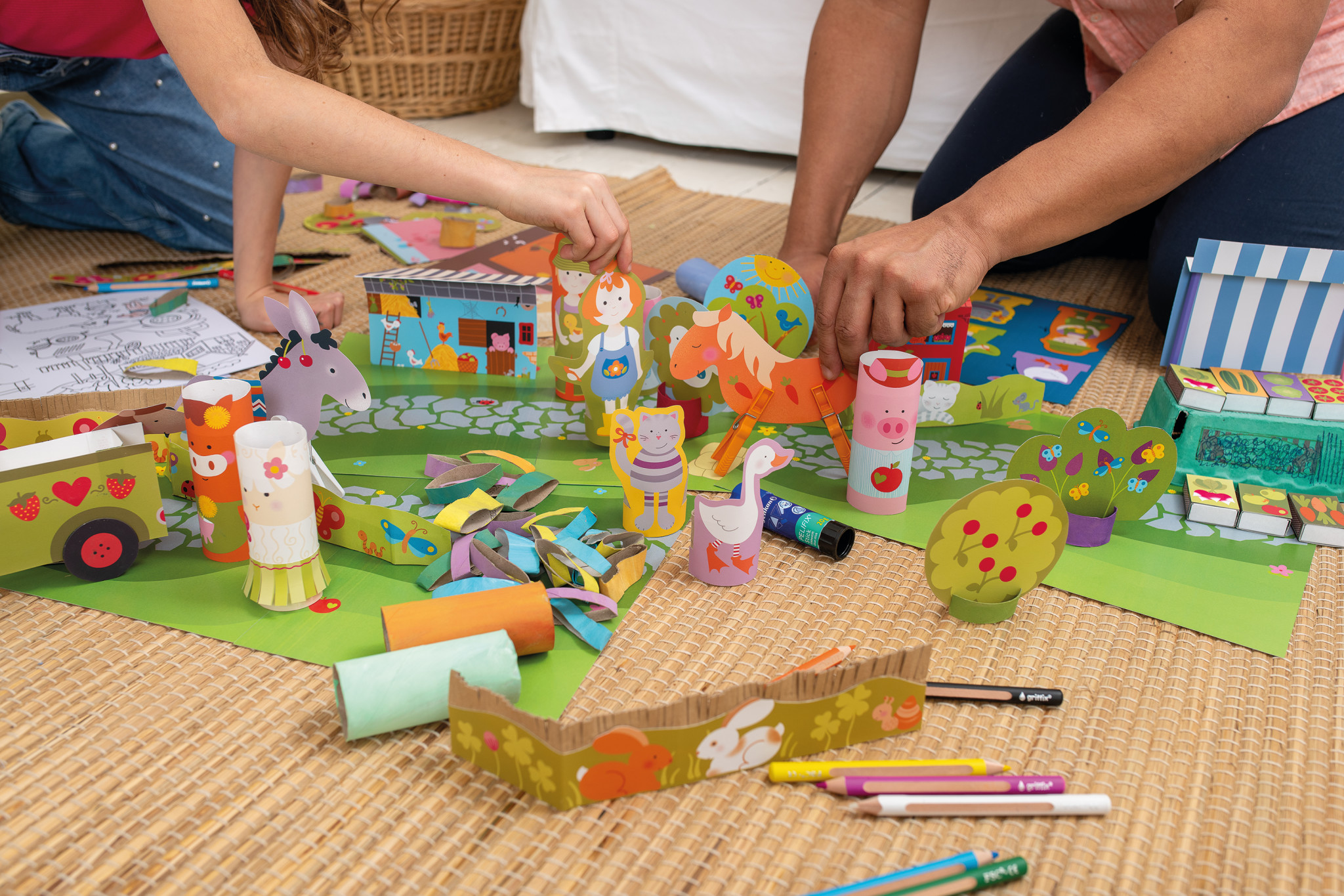 Upcycling craft book farm, man, boy, girl playing with craft objects farm, from the front |