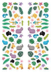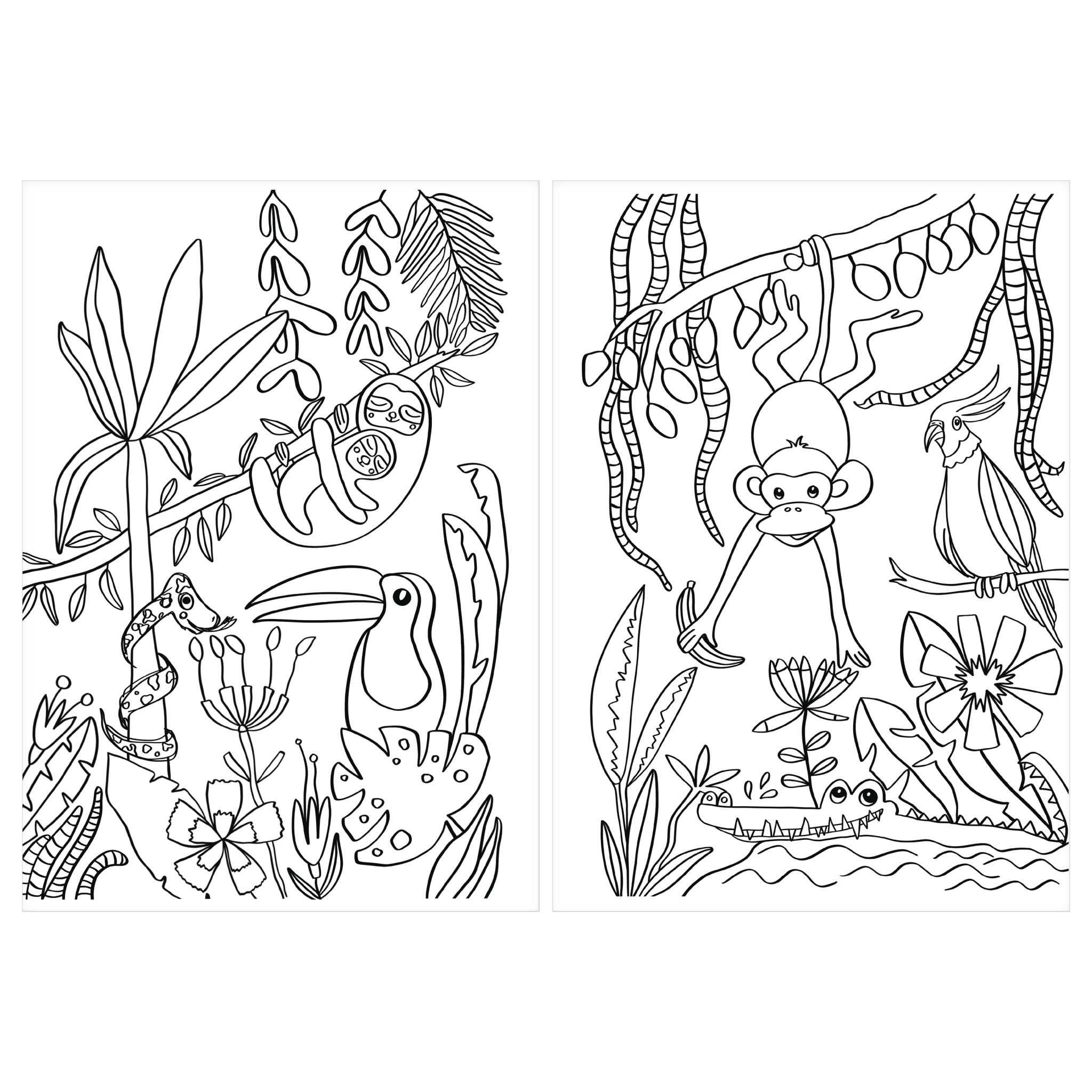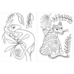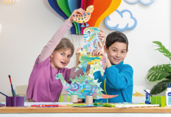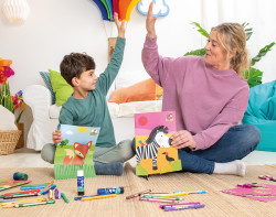 Craft coloring book animals, woman and boy show craft objects and high-five, from the front |