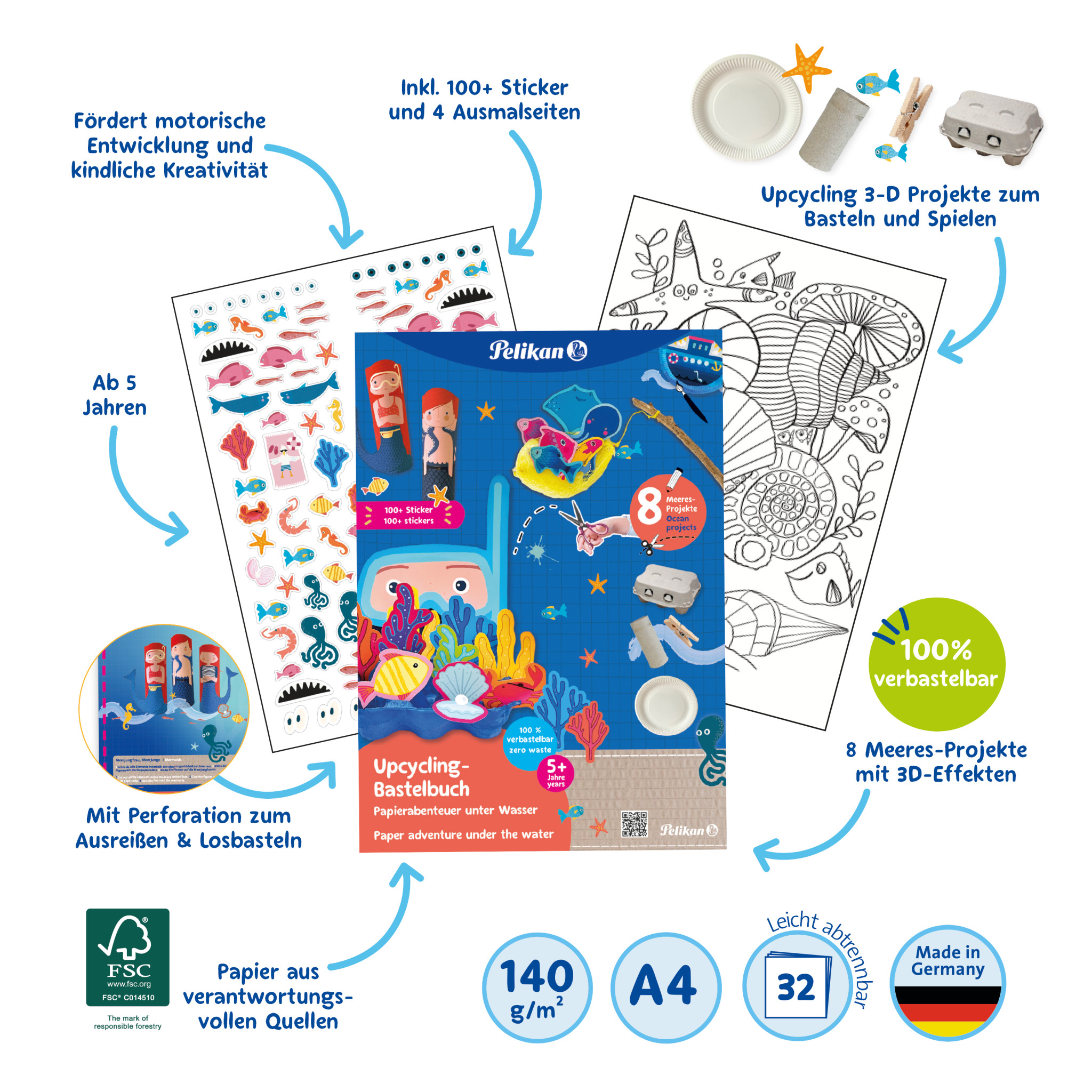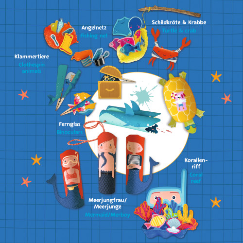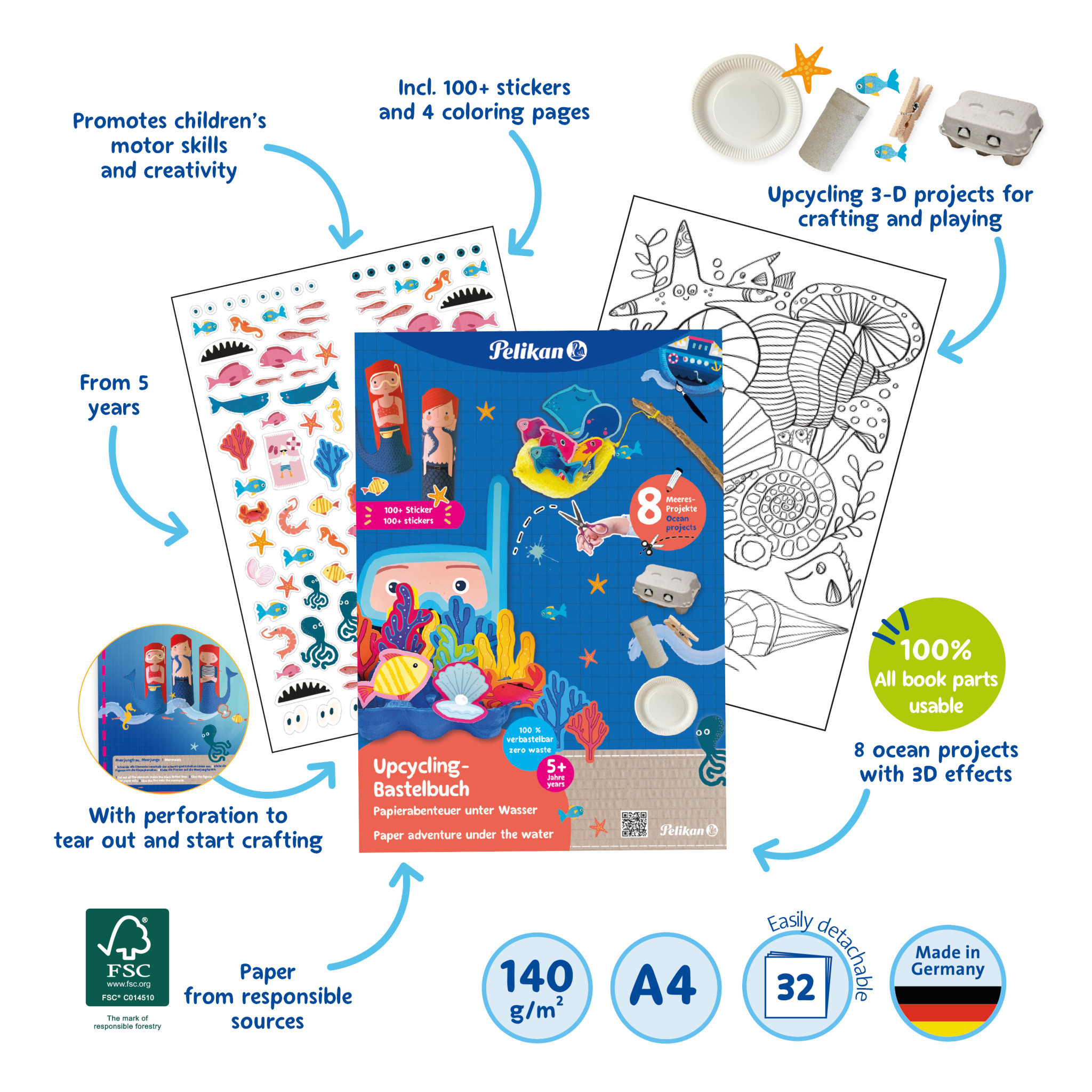 Upcycling craft book sea world, woman and boy play with craft objects sea world, from the front |