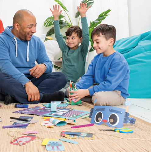 Craft coloring book space, boys and man tinkering on the floor, hands in the air, from the front |
