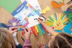 Crepe paper, clay paper, photo cardboard, woman, girl playing with craft objects, from the front |