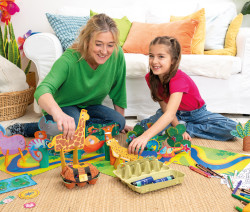 Upcycling craft book jungle, woman and girl playing with craft objects jungle, from the front |