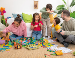 Upcycling craft book jungle, woman, man, 3 children playing with craft objects, telescope, from the front |
