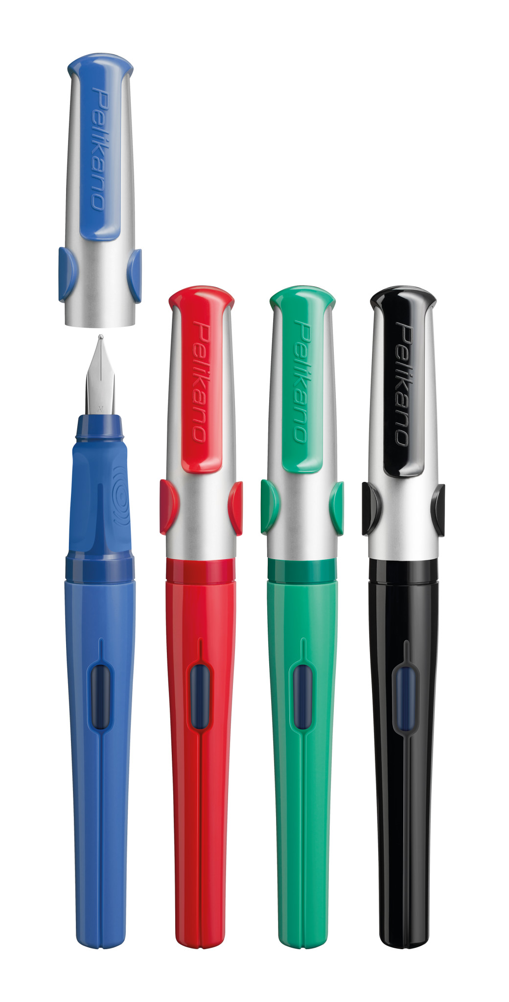Füllhalter Pelikano farbig sortiert, 4 Stück vertikal, 1x offen