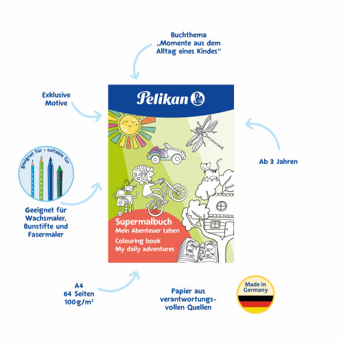 Das Pelikan Supermalbuch ist ideal für das Malen mit Buntstiften, Fasermalern und Wachsmalern. Das Supermalbuch beinhaltet ansprechende Motive zu Themen des Alltags eines Kindes für 3-5 Jährige. Das Inhaltspapier hat eine Grammatur von 100g/m² und der Umschlag hat eine Grammatur von 240 g/m². Das Supermalbuch hat das Format A4 und beinhaltet 64 Seiten. Made in Germany | |