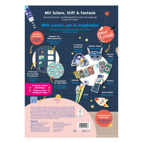 Bastel-Mal-Buch "Weltraum"; A4; Inhalt 32 Seiten; Grammatur Inhaltsseiten: 140g/m²; Grammatur Umschlag 300g/m²; Inhaltsseiten perforiert zum Abtrennen; Seiten beidseitig bedruckt; 2-Klammer Rückstichheftung; 7 Bastel- und Ausmalprojekte; Für 5-7 Jährige; FSC Mix; Fördert die Auge-Hand-Koordination