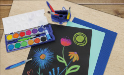 Zeichen- und Bastelblock; Format A4; Schwarzes Papier; 20 Blatt; Grammatur 120g/m²; Grammatur Deckblatt 160g/m²; Grammatur Rückenpappel 400g/m²; Kopfgeleimt; Optimal für Zeichnen und Malen mit Aquarellbuntstiften, weißen Stiften, Metallic Fasermalern, Deckfarben; Ideal zum Basteln; Schöne Farbergebnisse mit Deckfarben; Blauer Engel