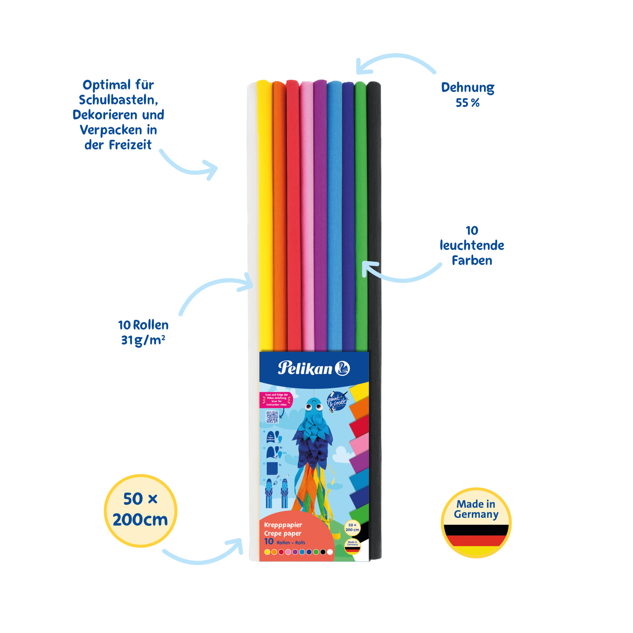 Pelikan Krepppapier - Set Basic in 10 leuchtenden Farben. Die Rollen des hochwertigen Krepppapiers haben die Größe 50 x 200 cm. Optimal für Schulbasteln und Dekorieren und Verpacken in der Freizeit. 10 Rollen verpackt im Polybeutel mit Einleger. | |