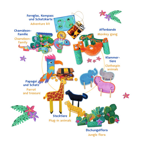 USP | Upcycling-Bastelbuch mit Stickern "Dschungel"; Format A4; Inhalt 32 Seiten; Inhaltspapier 140g/m²; 1x A4 Stickerbogen; Inhaltsseiten perforiert zum Abtrennen; Umschlag 235g/m², beidseitig bedruckt; Mit 2-Klammer Rückstichheftung; Beinhaltet 7-8 Upcycling 3-D Projekte; Für 5-7 Jährige; Mit dem Buch verwandeln Kinder Alltagsgegenstände oder Müll zu bunten 3-D Spielwelten; Das Buch wird beim Basteln komplett aufgebraucht; Fördert motorische Entwicklung und kindliche Kreativität; Aus 100% nachhaltigem FSC-Mix Material; Made in Germany |