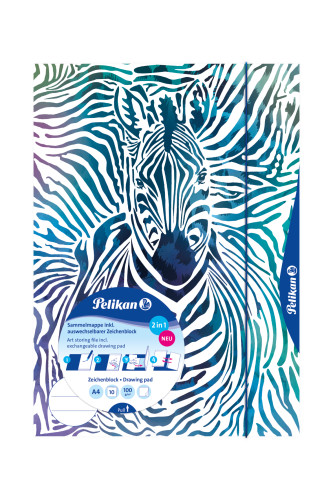 Kombimappe 2 in 1; Mit integrierten und auswechselbaren Zeichenblock; Für Schule und Freizeit; Format: DIN A4; Inclusive auswechselbarem Zeichenblock A4, 10 Blatt; Mit Namensfeld zur individuellen Beschriftung; Mit 3 Innenklappen; Mit Gummiband zum sicheren Verschließen; Design: Zebra; Farbe: Blaue Rückseite