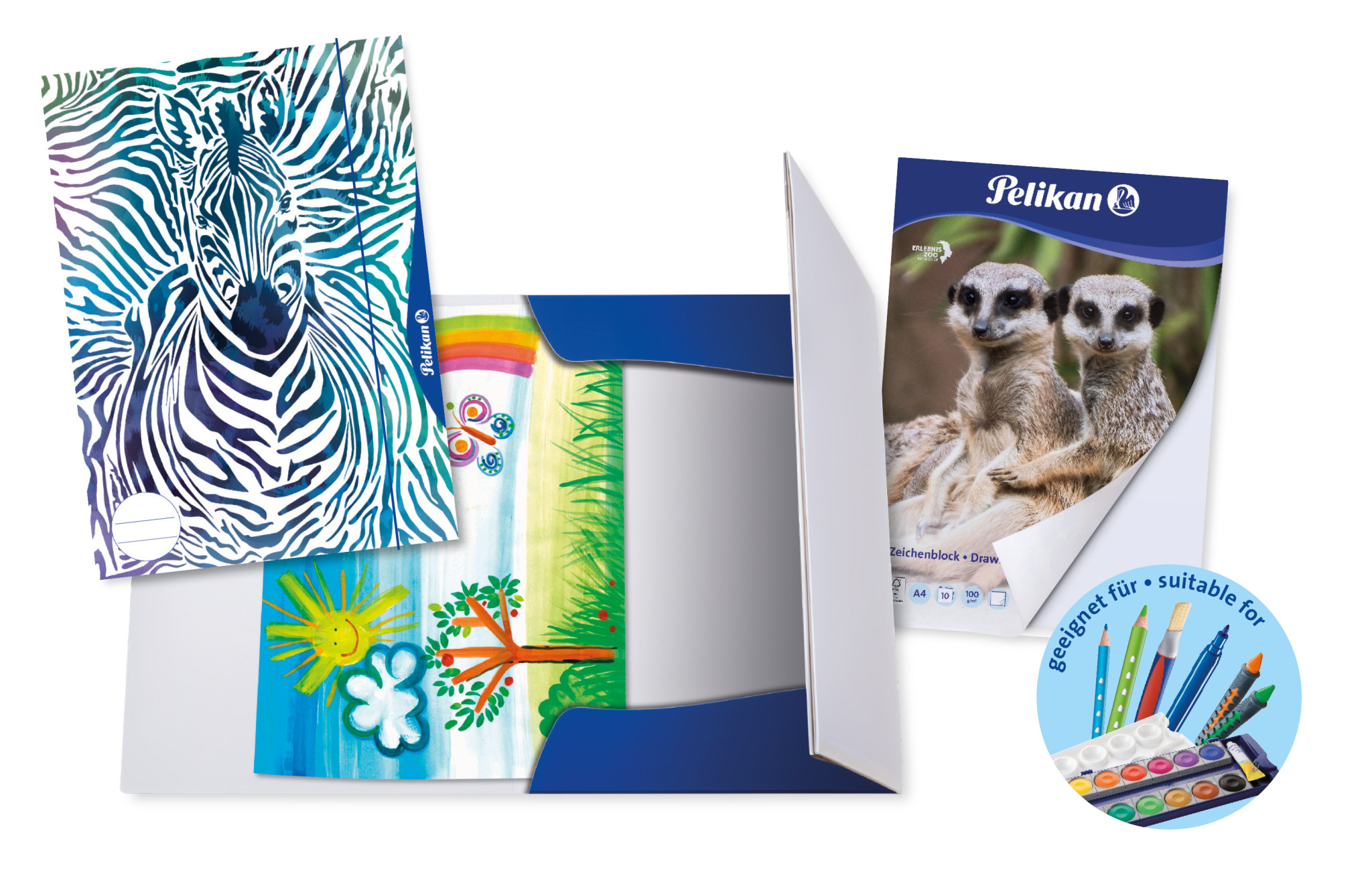 "Die Pelikan Kombisammelmappe ist eine Sammelmappe mit integriertem Zeichenblock in FSC - Qualität. Der Zeichenblock steckt auf der Längsklappe der Mappe und ist dort beim Transport sicher verwahrt. Zusammen mit 2 weiteren Innenklappen ergibt dies eine wunderbare Aufbewahrungsmappe. Das fertig bemalte Blatt gleich nach dem Gestalten in der Mappe ablegen - fertig. Ist der Zeichenblock aufgebraucht, wird er einfach durch einen neuen Pelikan-Zeichenblock aus dem Standard-Sortiment ausgetauscht. Die Kombisammelmappe ist die perfekte Unterstützung für den Kunstunterricht oder für die Freizeit. Gestaltete Kunstwerke können optimal in ihr aufbewahrt werden, durch das Gummiband kann nichts raus fallen. Die Kombisammelmappe hat ein schönes Design mit dem Motiv Zebra. Das vertikal angebrachte blaue Gummiband passt optisch perfekt dazu. Die Rückseite ist einfarbig dunkelblau. Auf der Vorderseite befindet sich ein Namensfeld zur individuellen Beschriftung. "