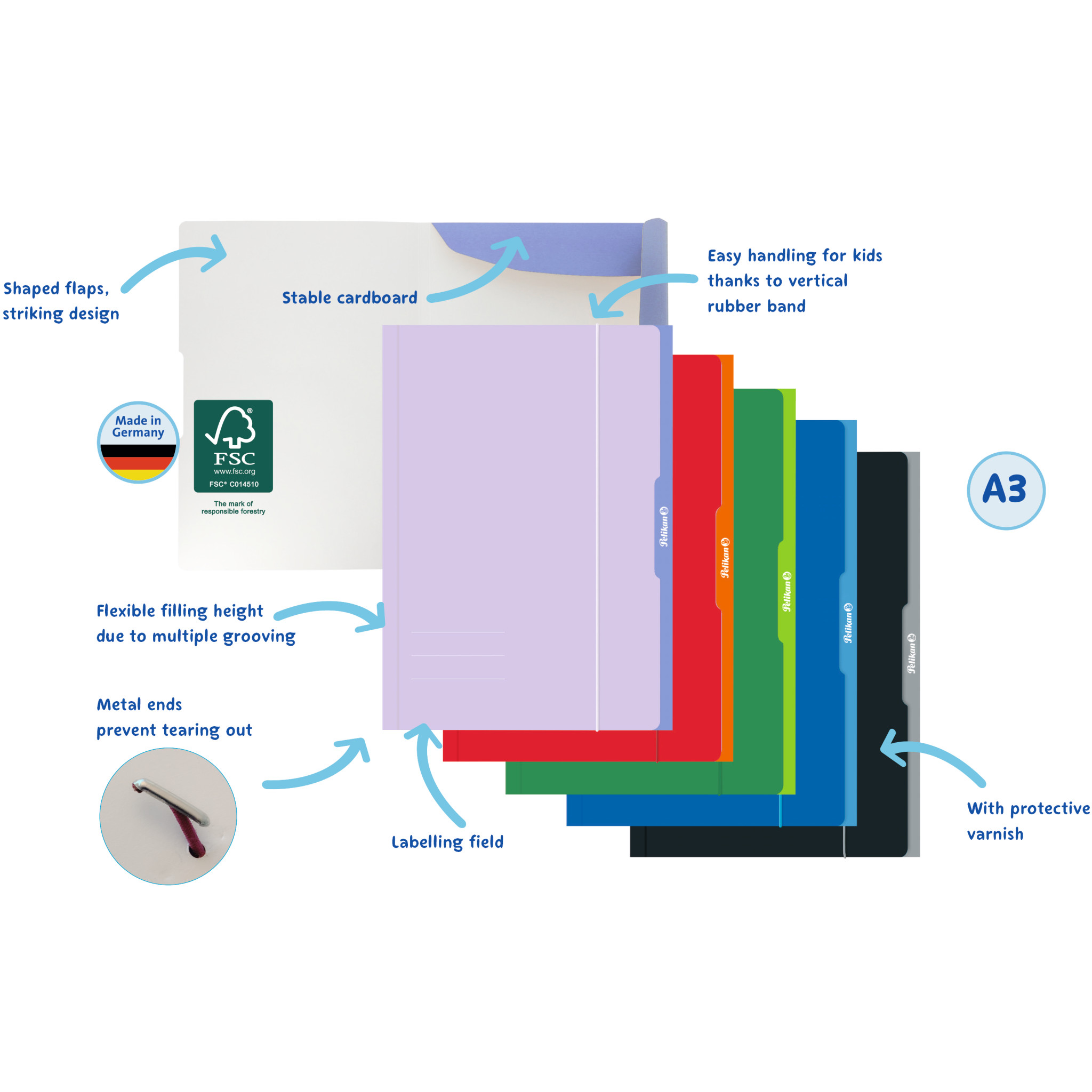 Die Sammelmappe A3 von Pelikan ermöglicht sicheres Verstauen von Kunstwerken. Gerade kleine Kinder malen gern und vor allem viel! In der Sammelmappe können die kleinen Künstler ihre „Erstlingswerke“ einfach und sicher verstauen. Auch später in der Schule sind die Aufbewahrungsmappen ein fester Bestandteil im Kunstunterricht und stehen meistens auf dem Schulzettel. Natürlich wird auch in der Freizeit gemalt, so dass auch hier Sammelmappen zur Aufbewahrung und für den Transport benötigt werden. Die Zeichenbogenablagemappe ist aus einem stabilen Chromokarton, 360g/m², mit Schutzlack hergestellt. Gestaltete Kunstwerke können optimal in ihr aufbewahrt werden, durch das Gummiband kann nichts raus fallen. Die vertikal angebrachte Spanngummischnur passt optisch perfekt dazu, die Metallspinte verhindern das Ausreißen. Auf der Vorderseite befindet sich ein Beschriftungsfeld. Aus 100% nachhaltigem FSC-Mix Material und Made in Germany. |