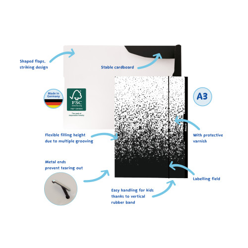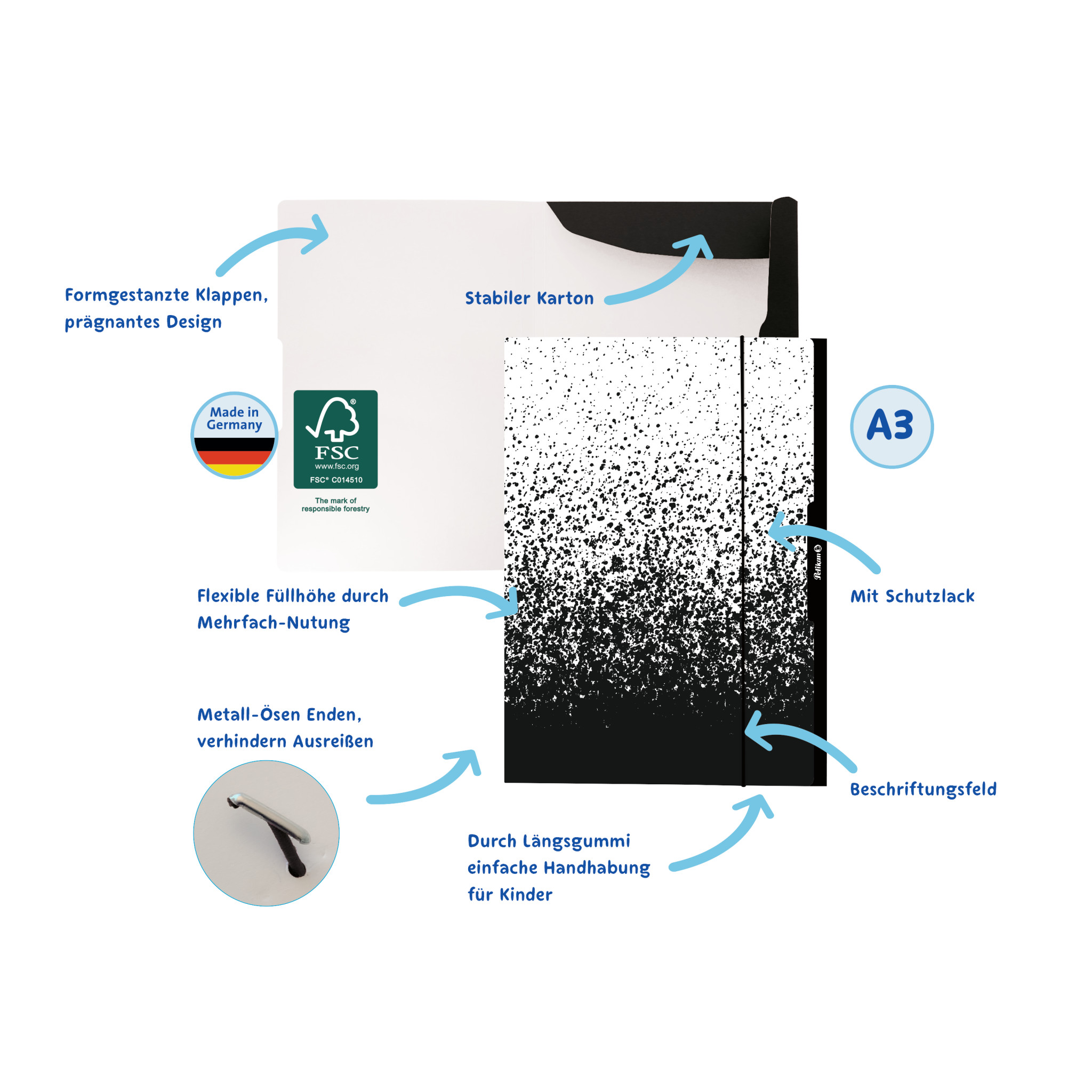 Die Sammelmappe A3 Color Edition schwarz/weiß von Pelikan ermöglicht sicheres Verstauen von Kunstwerken. Gerade Kinder malen gern und vor allem viel! In der Sammelmappe können die Künstler ihre Werke einfach und sicher verstauen. Auch in der Schule sind die Aufbewahrungsmappen ein fester Bestandteil im Kunstunterricht und stehen meistens auf dem Schulzettel. Natürlich wird auch in der Freizeit gemalt, so dass auch hier Sammelmappen zur Aufbewahrung und für den Transport benötigt werden. Die Zeichenbogenablagemappe ist aus einem stabilen Chromokarton, 360g/m², mit Schutzlack hergestellt. Gestaltete Kunstwerke können optimal in ihr aufbewahrt werden, durch das Gummiband kann nichts raus fallen. Die vertikal angebrachte Spanngummischnur passt optisch perfekt dazu, die Metallspinte verhindern das Ausreißen. Aus 100% nachhaltigem FSC-Mix Material und Made in Germany. |