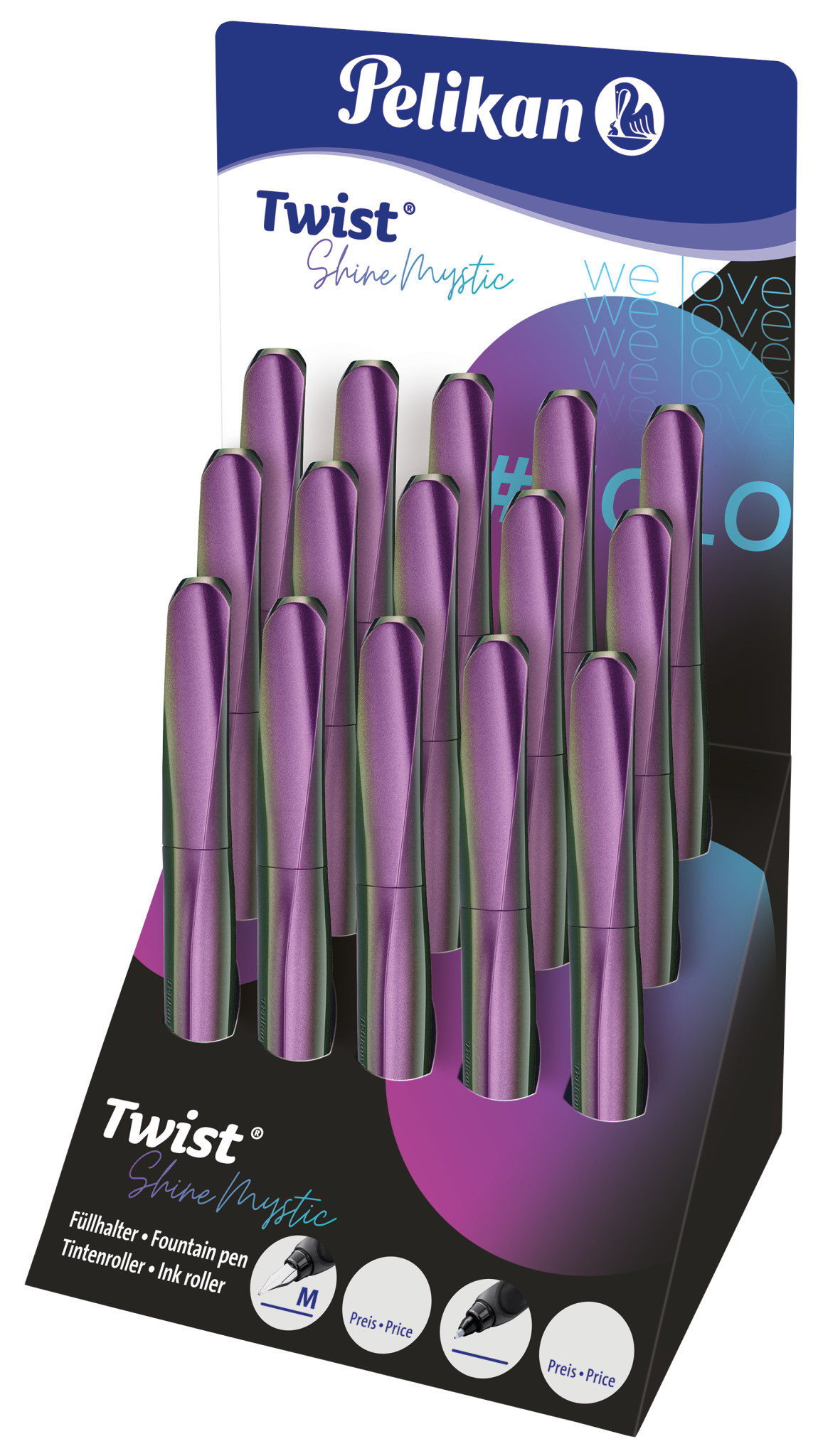 Display with 15 writing instruments. Contains 12 fountain pens and 3 ink rollers incl. ink cartridges in eye catching colors. Twist - the trend writing instrument for young people. Eye catcher with trendy color combinations. Fashionable fountain pen in twisted look. Lays perfectyly in the hand due to the ergonomical form. Suitable for both right- and lefthanders. Fountain pen with smooth writing steel nib. Made in Germany.