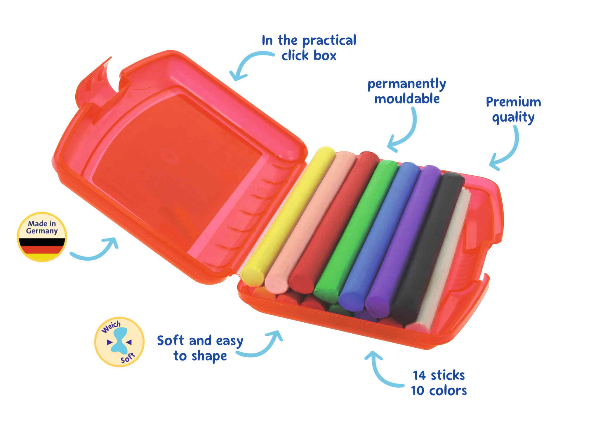 USP | Dauerplastische Kinderknete; Geschmeidig; Färbt nicht an den Händen; Fördert motorische und sensorische Fähigkeiten des Kindes; In langlebigem Kunststoff-Etui; Aus Wachs; 10 Farben in 14 Stangen Knetmasse; Farbe: 2 x Gelb, 2 x Rot, 2 x Grün, 2 x Blau, 1 x Orange, 1x Rosé, 1 x Lila, 1 x Rostbraun, 1 x Weiß, 1 x Schwarz; Inhalt: 240g, 14 Stangen; Made in Germany |