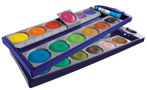 USP | Farbkasten mit auswechselbaren Farbschälchen; Farbschälchen aus 95% recyceltem Kunststoff; Mit 24 Qualitätsfarben; Starke Deckkraft dank hoher Pigmentdichte; Abnehmbarer Deckel mit Mischtöpfchen; Leicht zu reinigen; Platz für Pinsel im Deckel; Einfacher Klickverschluss; Platzsparend; Anschauliche Darstellung des Farbkreises; Stabiles Material; Mit Namensfeld für individuelle Beschriftung; Inklusive Deckweiß; Farbe: Blau-Weiß; Made in Germany |