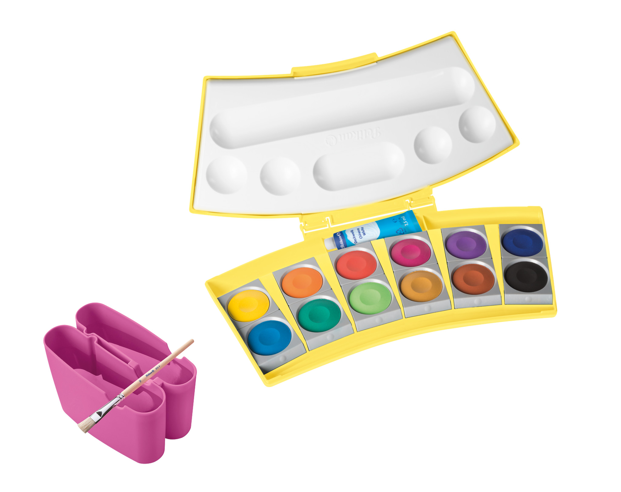 USP | Farbkasten mit auswechselbaren Farbschälchen; Mit 12 Qualitätsfarben; Hohe Deckkraft; Lichtechte Pigmente; Herausnehmbare Mischpalette; Mit 2 abnehmbaren Wasserboxen; Inklusive Deckweiß; Farbe: Gelb; Made in Germany |