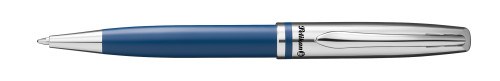 Metal ball pen with twist mechanism; Matte lacquered lower barrel; Chrome-plated upper barrel, clip and tip; Robust clip due to spring mounted installation; Equipped with replaceable king-size refill; Blue colored and in accordance with ISO 12757-2 document-proof ink