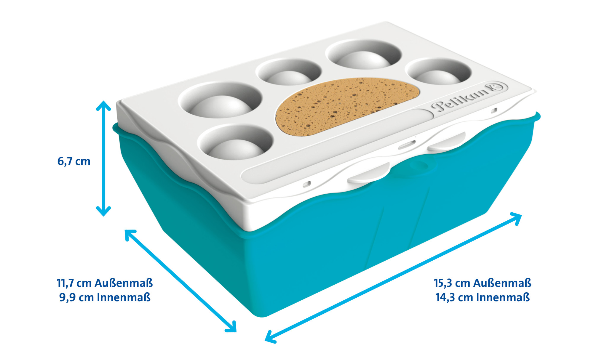 Kreativfabrik (creative factory) colouring accessories set small. Content: turquoise 3-compartment water box with storage space for griffix brushes, white mixing palette as a lid, sponge for dabbing off wet brushes and 1 sticker sheet for individual decoration and name tagging. Basic set for other creative floors from the product range of Kreativfabrik. Suitable as an accessory for various water-soluble painting materials, e.g. K12 opaque paint box or water-soluble crayons. With banderole with euro hole. |