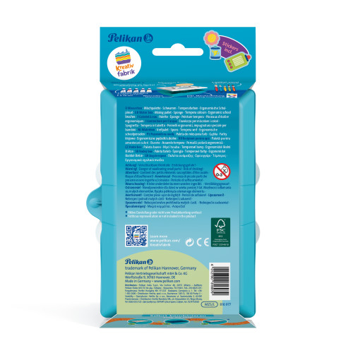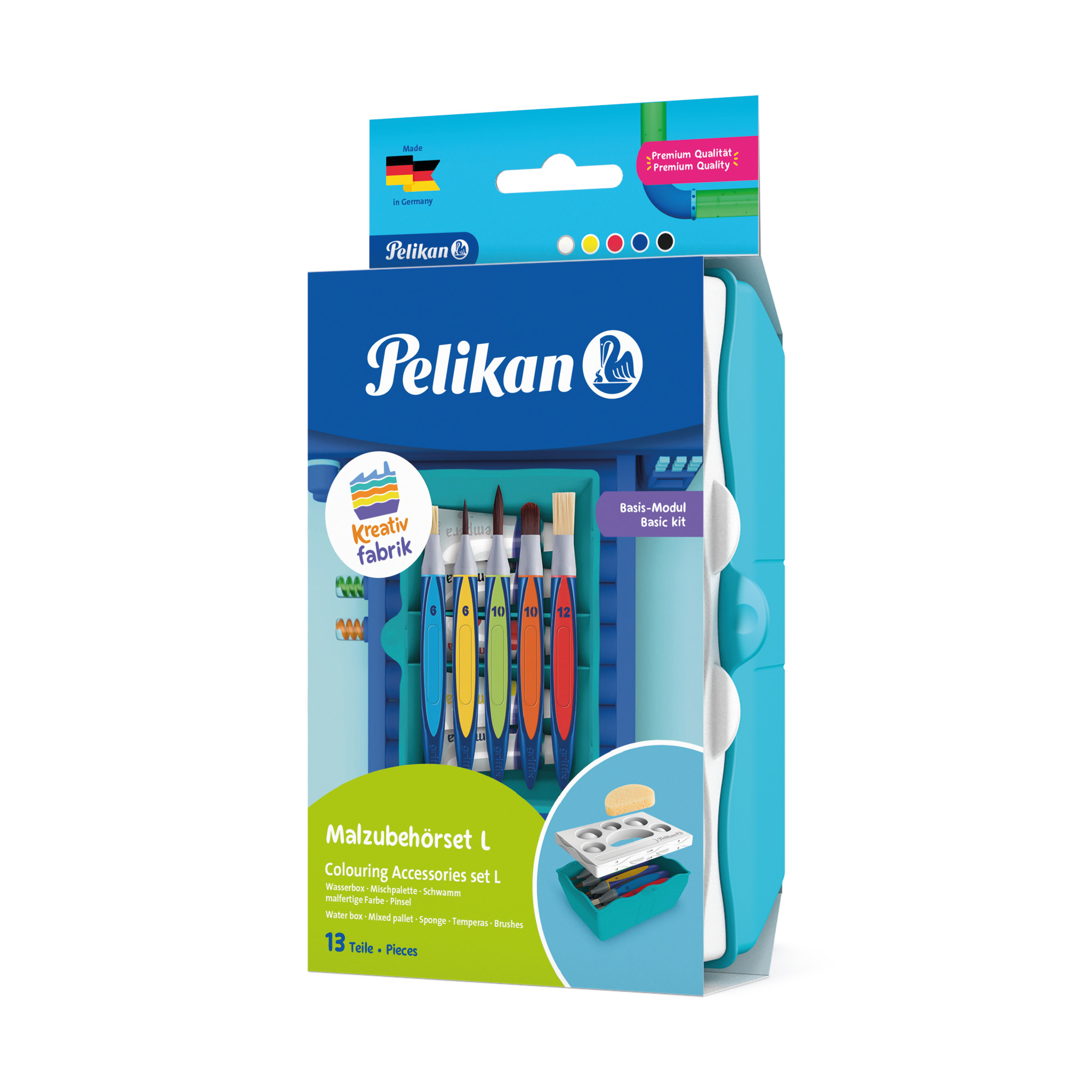 | USP | Großes Basisset der Pelikan Kreativfabrik; Dreifachgeteilte Wasserbox; Mit praktischer Mischpalette und Schwamm; Mit Pinselablage; Stabil und Kippsicher; Für Schule und Freizeit; Enthält griffix® Pinselset bestehend aus 12er und 6er Borstenpinsel, 10er und 6er Haarpinsel, 10er Katzenzunge; Enthält 5 Tuben Temperafarbe a 12ml mit Mischanleitung; Beliebig erweiterbar mit den Kreativ-Etagen der Pelikan Kreativfabrik; Inkl. Stickerbogen zum Indivisualisieren und für die Namenbeschriftung; Made in Germany |