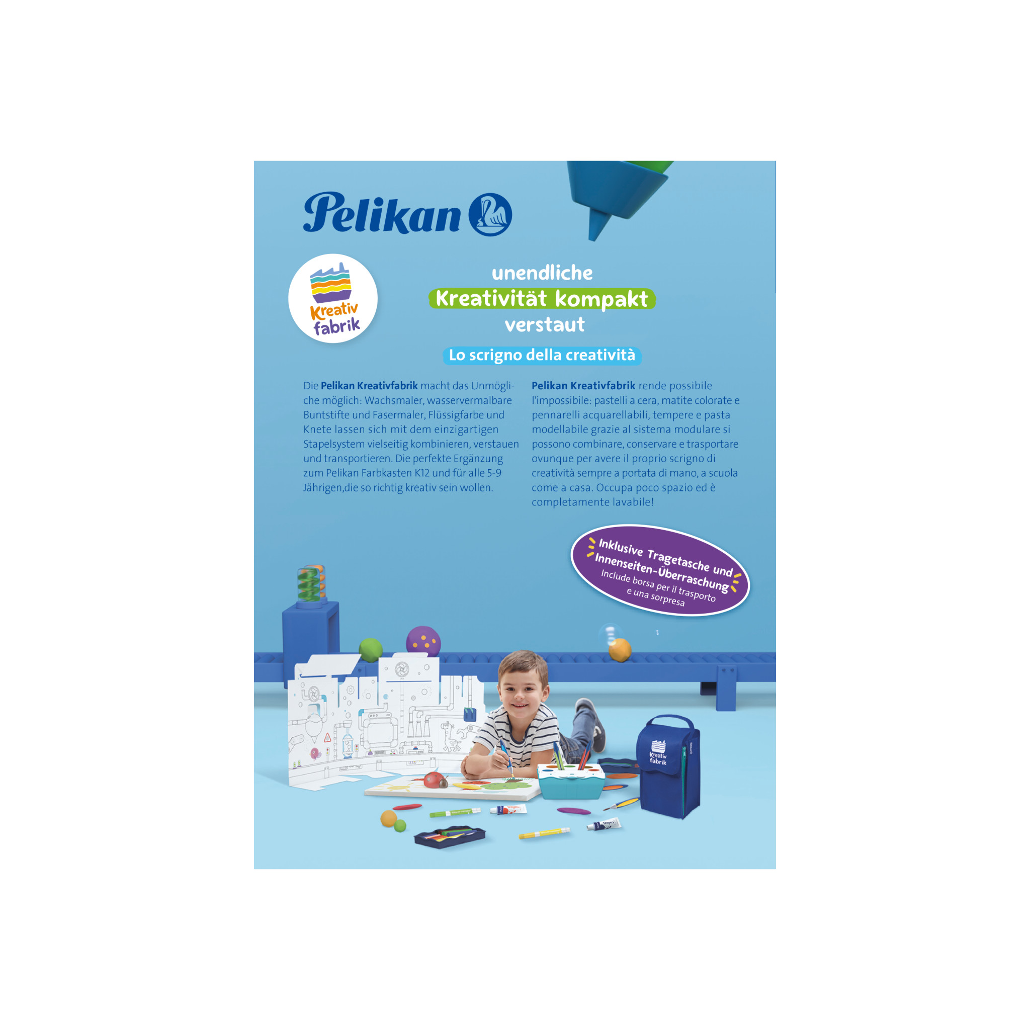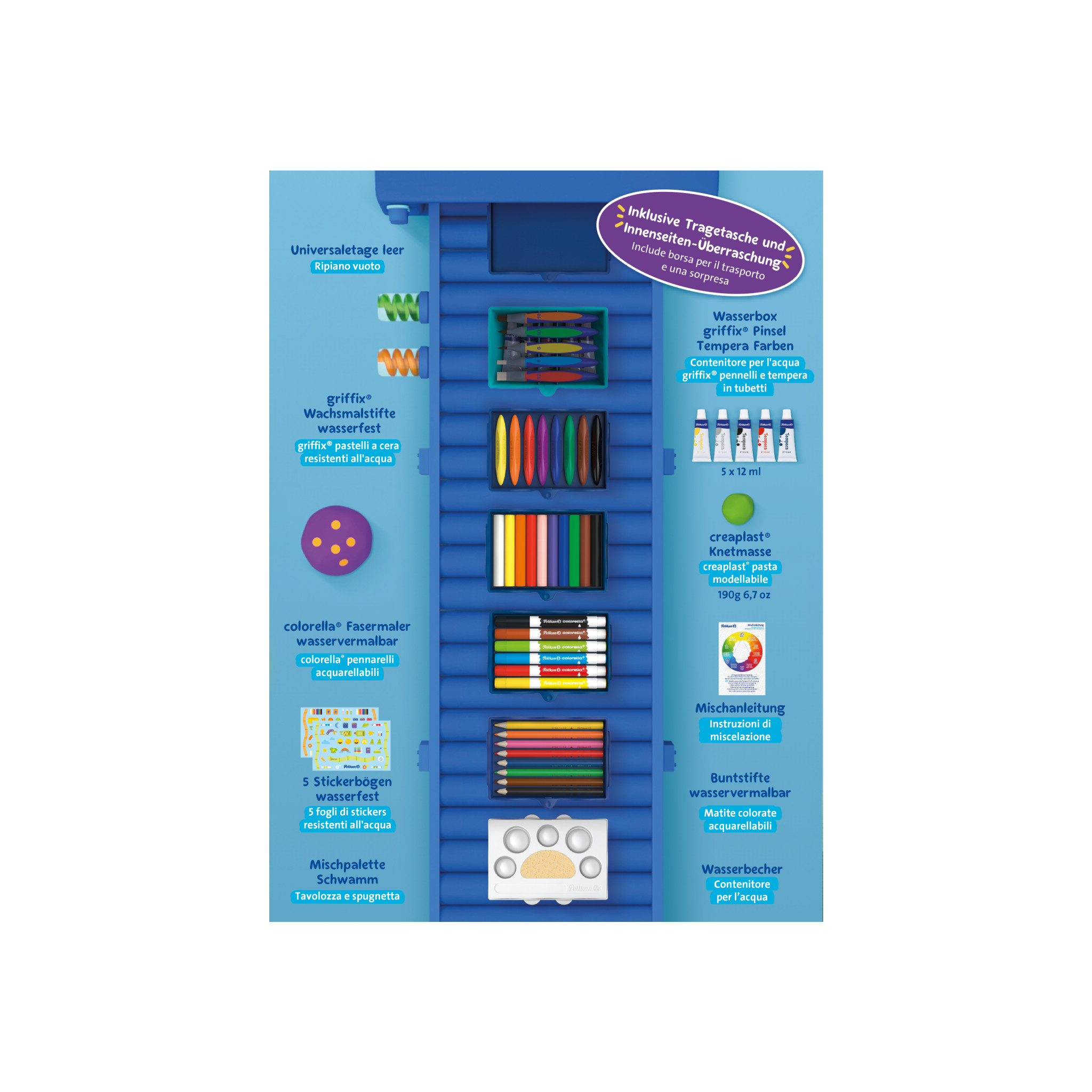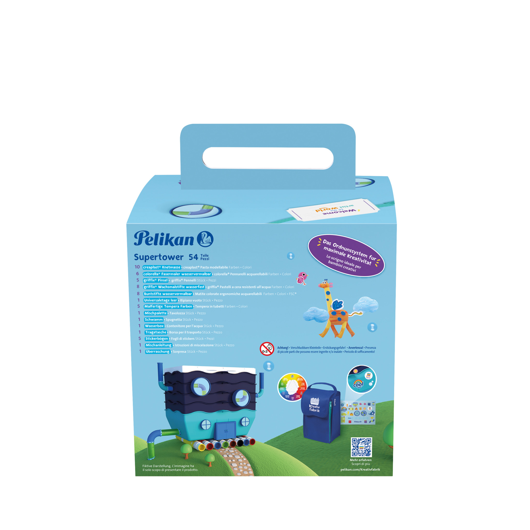 | USP | Pelikan Kreativfabrik Supertower bestehend aus 54 Teilen; Dreifachgeteilte Wasserbox; Mit praktischer Mischpalette und Schwamm; Mit Pinselablage; Stabil und Kippsicher; Für Schule und Freizeit; Kreativität kompakt verstaut; Einzigartiges Stapelsystem; Enthält griffix® Pinselset bestehend aus 12er und 6er Borstenpinsel, 10er und 6er Haarpinsel, 10er Katzenzunge; Enthält 5 Tuben Temperafarbe mit Mischanleitung; Enthält Kreativ-Etage mit 6 wasservermalbaren Colorella® Filzstiften; Enthält Kreativ-Etage mit 8 wasserfesten griffix® Wachsmalstiften; Enthält Kreativ-Etage mit 8 wasservermalenbaren, dicken Buntstiften; Enthält Kreativ-Etage mit 10 Stangen Creaplast® Knetmasse; Enthält eine leere Universaletage zum individuellen Befüllen; Beliebig erweiterbar mit den Kreativ-Etagen der Pelikan Kreativfabrik; Inkl. 5 Bögen mit wasserfesten Stickern zum Indivisualisieren und für die Namenbeschriftung; Mit passender Tragetasche; Mit Aus-und Weitermal-Vorlage auf der Verpackungs-Innenseite |
