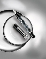 Souverän - A world-famous classic. The production of the tortoise shell is subject to an elaborate process, because according to a recipe specially developed for Pelikan, a striped piece of material is made from cotton material in many steps, which is bent and then polished to contour with a diamond. The special feature of the tortoiseshell material is its slight material transparency and the different color nuances that give the material its shimmering effect. The palladium-plated rings on the filler grip and cap are fitted with the utmost precision before the writing instrument is polished to a high gloss. The slightly springy, typical Pelikan beak clip gives this high-quality writing instrument its unmistakable design. The Souverän M605 piston fountain pen features a 14-carat rhodium-plated gold nib and is available in EF, F, M and B nib widths. The EF nib ensures an extra-fine typeface and is particularly suitable for handwriting with small curves. |