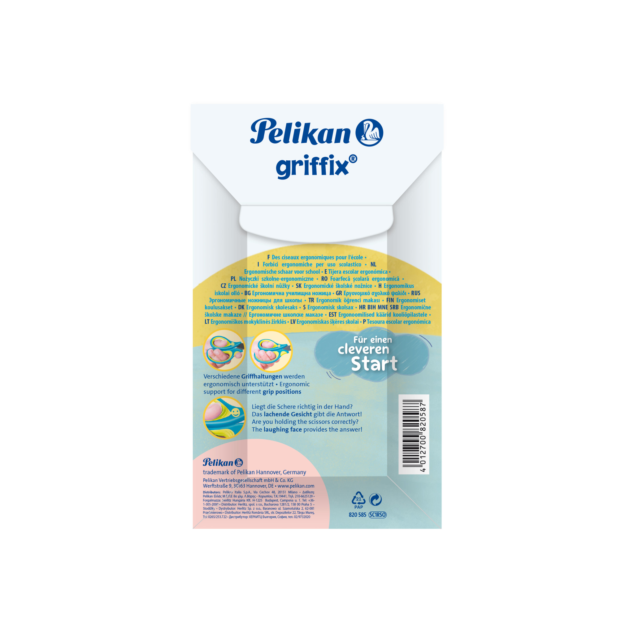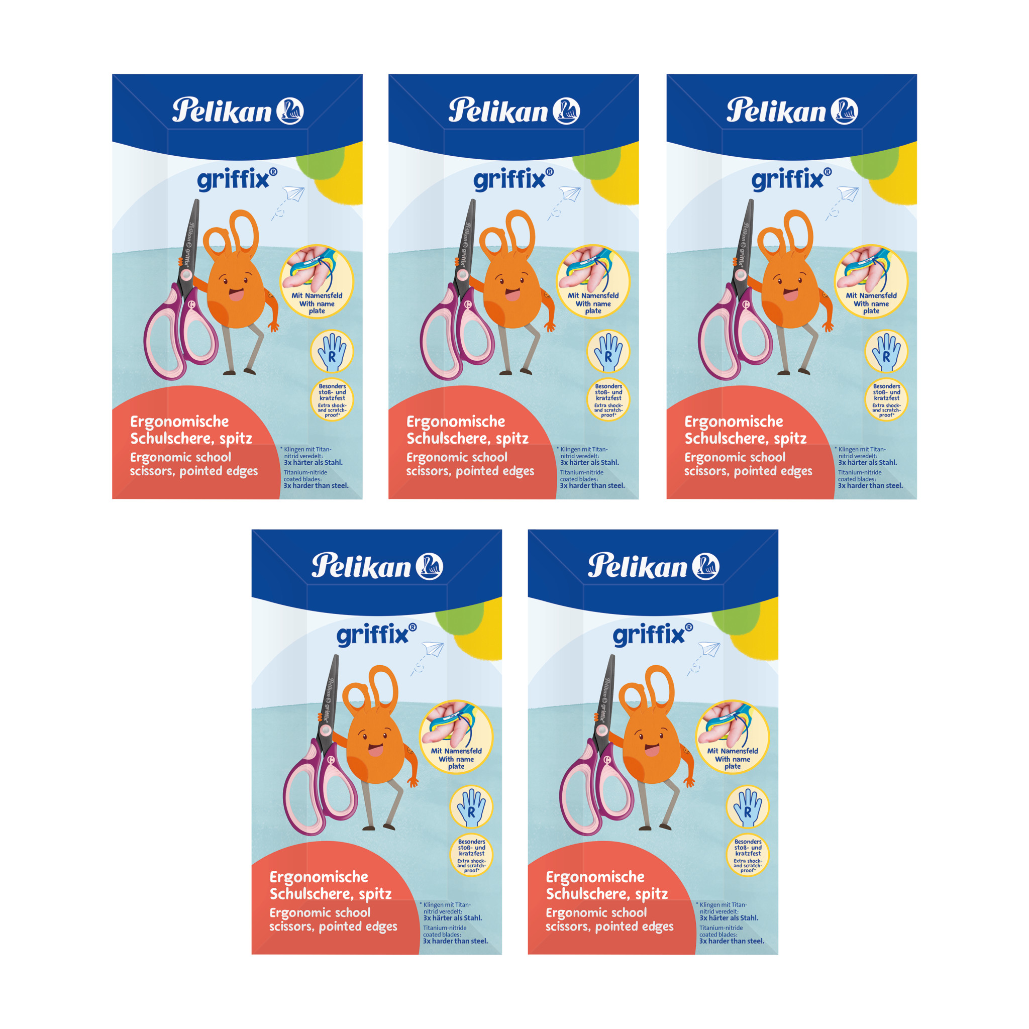 | Die Pelikan griffix® Schere mit spitzer Klinge ist ideal für kleinere, filigrane Schneidarbeiten. Die Klinge der Schulschere ist dank einer Titan-Nitrid-Beschichtung 3 x härter als Stahl. Dank des ergonomischen Griffs liegt die Schere bei Kindern besonders gut in der Hand. Das harte und weiche, hochwertige Kunststoff des Griffes ist PVC- sowie latexfrei. Wie beim beliebten griffix® Schreiblernsystem sorgt das lachende griffix®-Gesicht für die richtige Handhaltung. Mit Namensfeld. | |