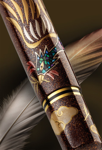 Maki-e is a complex art of Japanese lacquer painting and is renowned for its beauty and artistry. In the process, the rare Japanese lacquer Urushi is applied to the fountain pen in a multitude of layers which are polished repeatedly. The design is drawn with colored lacquer onto the surface. This technique is called Togidashi-Maki-e. In addition, the artist can mix charcoal powder and gold powder into the lacquer, so that the pattern of the design is raised above the surface: If your thumb glides over the painting, you will feel the difference. This is the so-called Taka-Maki-e technique. For the Pelikan fountain pen model “Phoenix”, the Maki-e artist has harmoniously blended both techniques. The Phoenix is surrounded by numerous meaningful legends. Phoenix is a legendary spiritual bird in Chinese mythology, appearing in myths, ornaments, works of art, and architecture in East Asia. It is often depicted as a symbol of virtue, wisdom, beauty, and goodness. Phoenix also has the meaning of harmony, peace, femininity, beauty, prosperity, expansion, ascent and success. According to Chinese legends, phoenix represents the entire universe. The phoenix‘s head represents the sky, the eyes are the sun, the back is the moon, the legs are the earth, and the tail is a planet. It has been thought that a presence mediates between God and man, as well as dragon. In China, the Emperor has made the dragon his symbol, while phoenix is the symbol of the empress. Phoenix has always been considered a noble and auspicious symbol. Pelikan Maki-e „Phoenix“ fountain pen is a masterpiece that combines the craftsmanship of Pelikan Germany based on more than 180 years of tradition and technology coupled with superior Japanese traditional Maki-e painting techniques. Each Souverän M 1000 fountain is produced in Germany and then decorated in Japan. Every single pen has the Pelikan logo on the crown, a limited-edition number, and the artist’s signature drawn in by hand using Maki-e techniques. The “Phoenix”, released in the year 2022 is available in a limited edition of only 123 pieces worldwide. Each fountain pen is equipped with a finely chased 18 carat, two-tone gold nib and is encased in a traditional Japanese pen box of paulownia wood. |