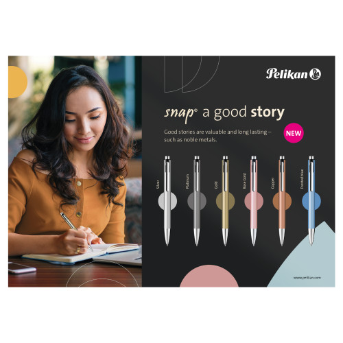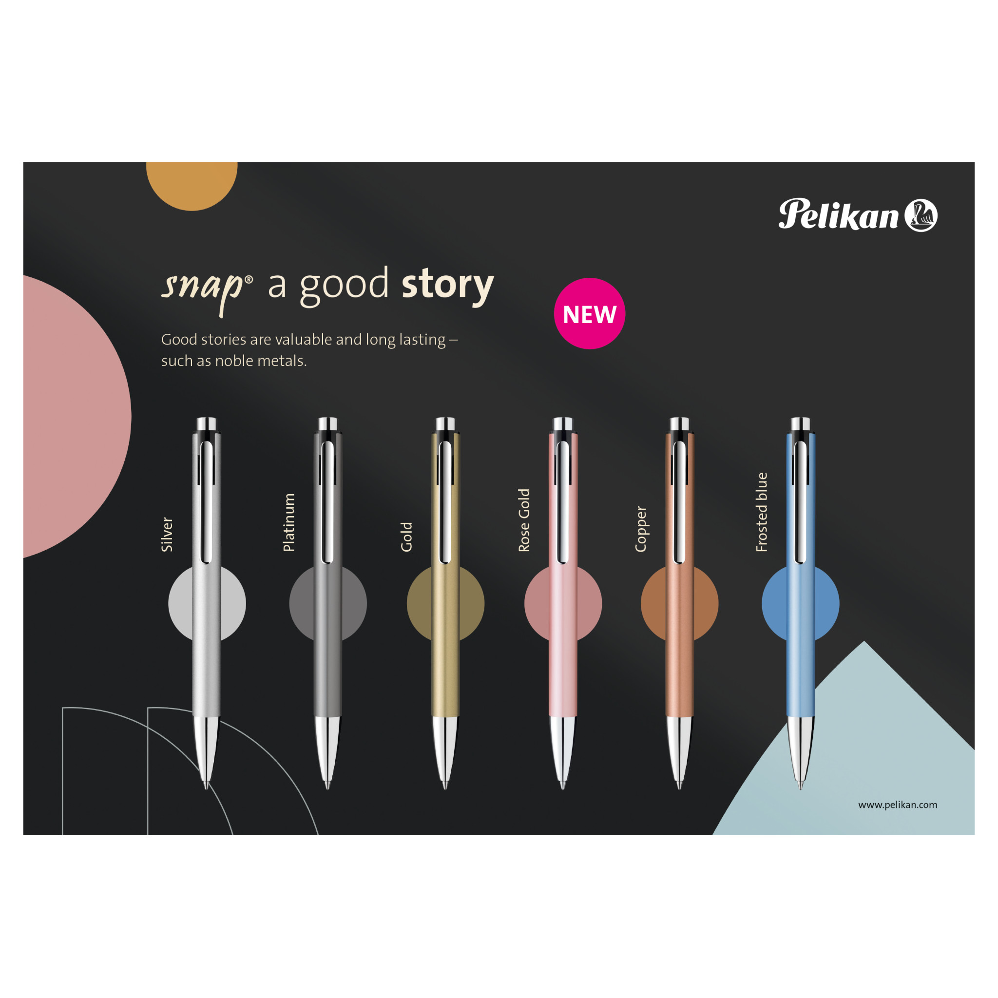 "The Snap® ballpoint pen is defined by its clear formal language, which is made for people with a preference for purist minimalist aesthetics. This design concept is combined with a pearl finish that underlines the high-grade look of the pen. The ballpoint pen with push mechanism is named for its clip with snap mechanism. When the refill is extended, it snaps into the push-button mechanism. By pressing the upper part of the clip, the mechanism becomes unlocked, and the refill retracted. The Snap® ballpoint pen is largely made of recyclable metal. Both the push-piece and the Aluminum barrel are cylindrically shaped. This shape merges into the conical brass tip. The brass tip, which is heavier than Aluminum, ensures that the center of gravity is shifted towards the tip, thus enabling ergonomically optimized writing. The device is equipped with an exchangeable king-size refill with soft tip (size M) and a blue paste that is more document-proof according to ISO 12757-2. While the push-button, clip and tip are shiny chrome-plated, the Aluminum barrel is pearl lacquered. This gives the device its shimmering metallic look, which is available in silver, platinum, gold, rose gold, copper and frost blue. " |