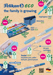 USP | Made in Germany; 1 Fountain pen + 1 giant ink cartridge with royal blue ink in folding box; Twist® eco; plastic injected; suitable for right- and left-handers; ergonomic shape; twisted look; stainless steel nib size M; color blue; fountain pen made of 78% recycled plastic; FSC folding box |