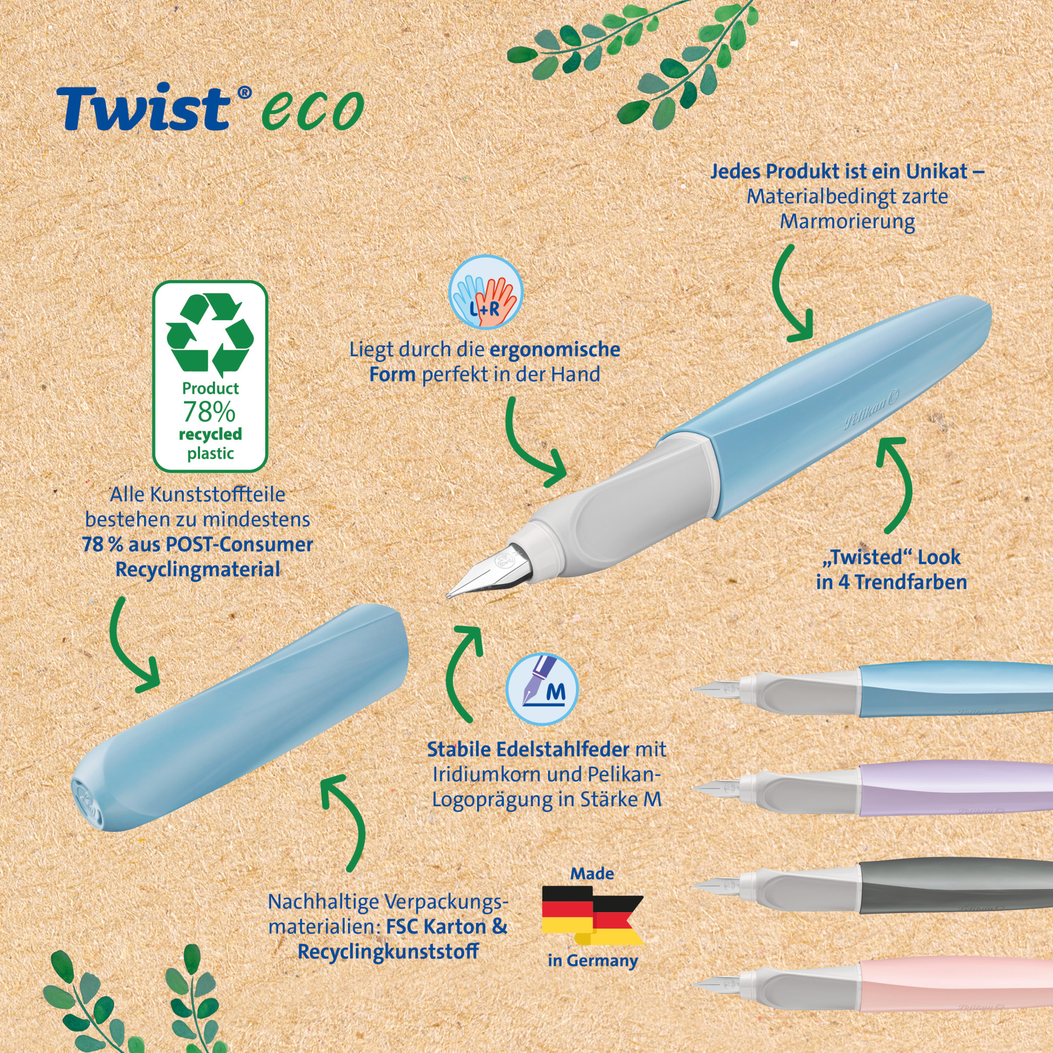 USP | Made in Germany; 1 Fountain pen + 1 giant ink cartridge with royal blue ink in folding box; Twist® eco; plastic injected; suitable for right- and left-handers; ergonomic shape; twisted look; stainless steel nib size M; color lavender; fountain pen made of 78% recycled plastic; FSC folding box |