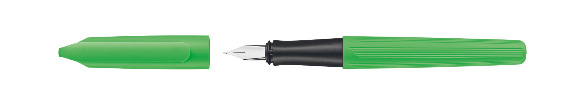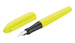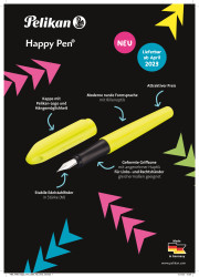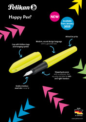 Made in Germany; 1 Fountain pen + 6 ink cartridges with royal blue ink in Blister pack; Happy Pen; suitalble for right- and left-handers; ergonomic shape; stainless steel nib size M; colors assorted; 2 colors neon yellow and neon green