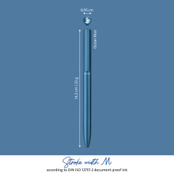 USP | Ballpoint pen with twist mechanism; Purist clipless design; Pearl anodized upper and lower part; Slim shape; Equipped with replaceable king-size refill; Blue colored and in accordance with ISO 12757-2 document-proof ink |