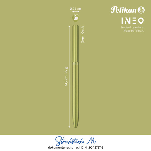 Unique and eye-catching - that is INEO, the new writing instrument series from Pelikan. The series is characterized by its unique design language. The sandblasted surface provides a matte finish to the colorful anodized devices, which makes the pen pearl shimmering in the light. The look and feel is inspired by minimalism with its reduced design language, calm colors and high-quality processing of natural materials. The special highlight of the Ineo is the missing clip. A feature that sets it apart from other writing instruments of its kind and makes it an eye-catcher in everyday life. INEO is currently available as fountain and ballpoint pen in 6 trendy colors: Clearing Breeze (silver), Black Rock (black), Ocean-Blue (petrol-blue), Lavender Scent (purple-violet), Fiery Red (red) and Green Oasis (green). |