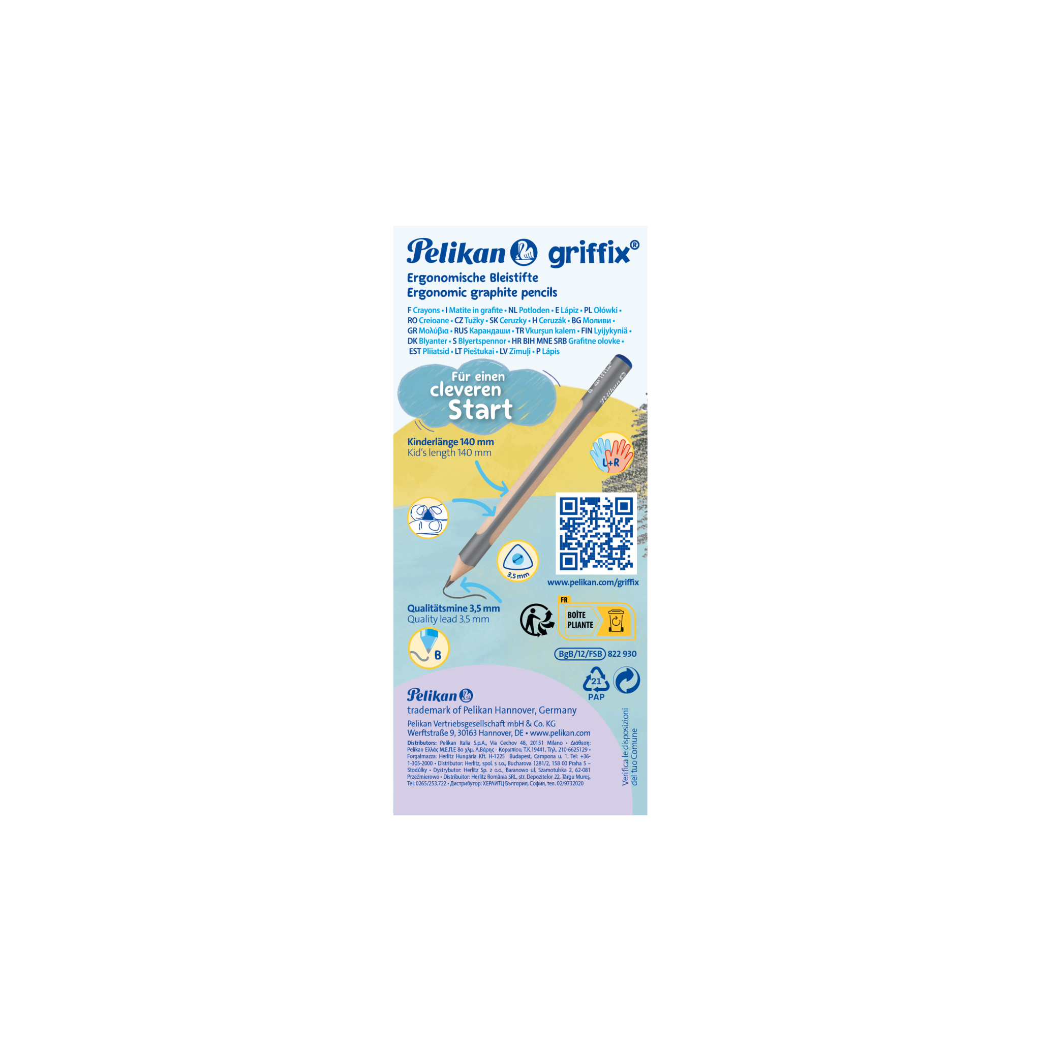 Learning to draw and write made easy. The classic learn-to-write pencil is required in many schools. It is an important companion for children's first swing exercises and writing attempts before they start writing with ink. But it is also used for drawing. The thick griffix pencils with their long, symmetrical triangular grip shape, similar to griffix brushes, perfect the griffix writing system idea: a grip zone for left- and right-handers alike, on the way to a relaxed tripod grasp. The 3.5 mm thick quality lead guarantees a good graphite application even with little pressure. Hardness grade B is slightly softer and darker than HB and particularly suitable for learning to write. The crayons are 140mm long - designed for small children's hands. This package of 12 pencils enables individual sale, as each pencil is equipped with an EAN code. Price referce to on piece. The identically shaped griffix wooden crayons are also available. | |