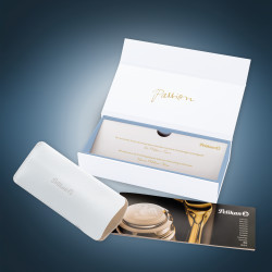 A new lightness. A soft pastel blue swirls with pearl effects in the barrel, conjuring up ever new variations on the hue. The soft blue material is semi-transparent, allowing a glimpse into the interior of the fountain pen. In combination with the white precious resin and the gold-plated decorative elements, the result is a balance between noble design and a refreshing color impression. The piston fountain pen is finished with 24ct gold-plated decorative elements such as rings and the Pelikan beak clip. The fountain pen, with its stainless steel nib that is also gold plated, offers a smooth writing experience. The nib width B is especially suitable for all very large letters and sweeping curves of an individual handwriting or for all those who prefer a wide ink application. |