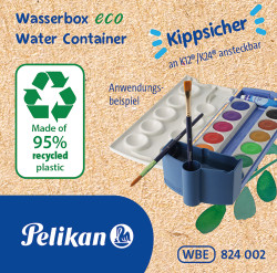 Wasserbox eco – die umweltfreundliche Variante. Dieser praktische Wasserbecher ist die perfekte Ergänzung zum Pelikan Farbkasten K12® oder K24®. Der Pinselbecher kann kippsicher direkt an das Unterteil des Farbkastens angesteckt werden und ermöglicht so schnelles und sauberes Arbeiten in der Schule oder zu Hause. Diese Wasserbox besitzt nicht nur einen runden Köcher zur Aufbewahrung von Pinseln während des Malens sondern auch Mulden zur Ablage von Pinseln. Das verwendete Post consumer Recyclat ist das denkbar nachhaltigste Material. | |