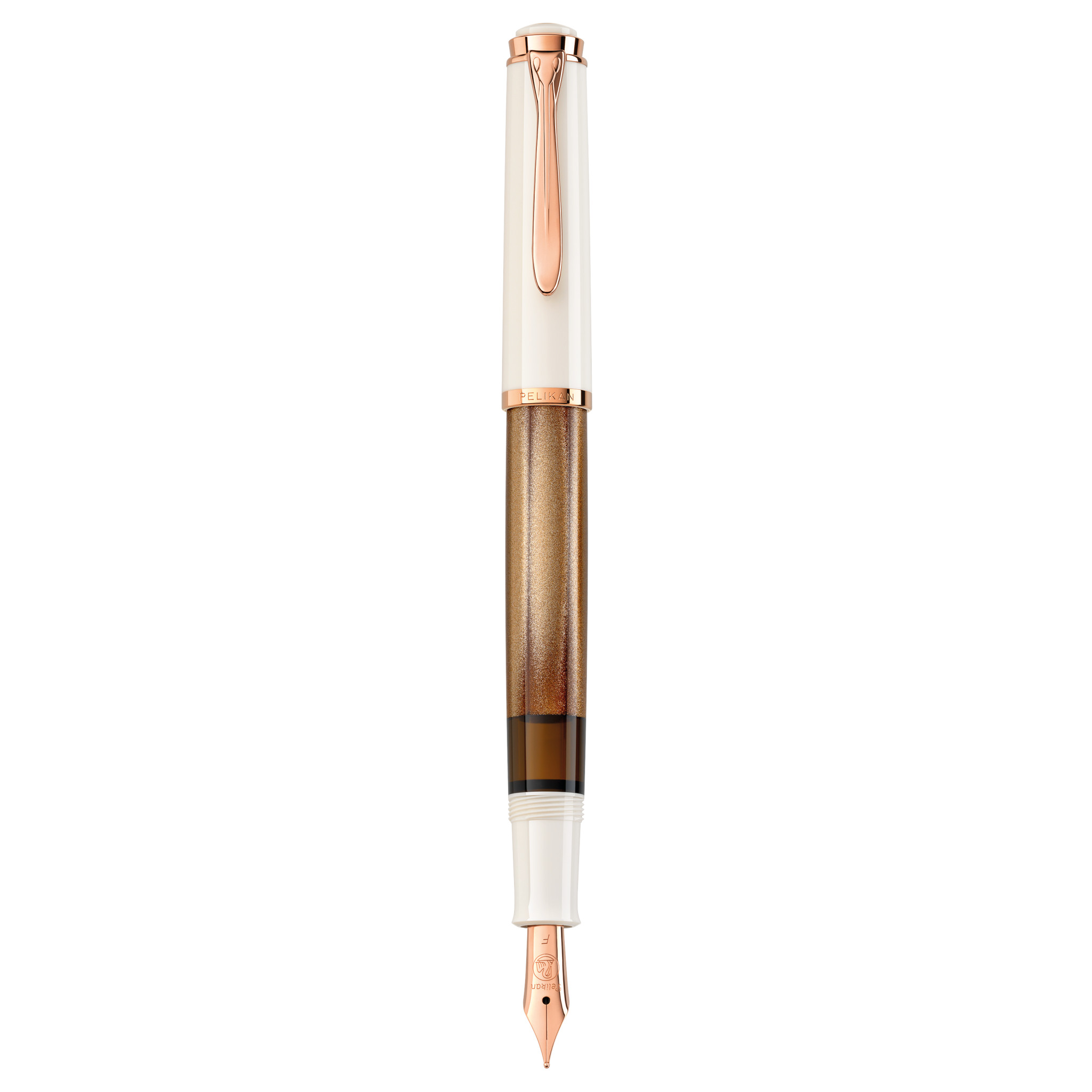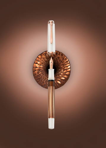 USP | High-quality piston fountain pen; With rose-golden decorative elements; Swirling copper swipes within the barrel in combination with a brown ink window; rosegolden plated stainless steel nib; Particularly soft writing feeling; With typical Pelikan beak-like designed clip; Nib: F; Color: Copper Rose Gold; Made in Germany |