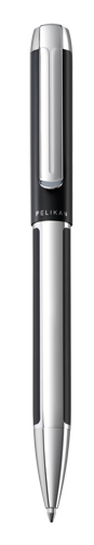 Ball pen with twist mechanism; High-grade, anodized aluminum barrel with matte and glossy surface finish; Robust clip due to spring mounted installation; Equipped with replaceable king-size refill; Black colored and in accordance with ISO 12757-2 document-proof ink