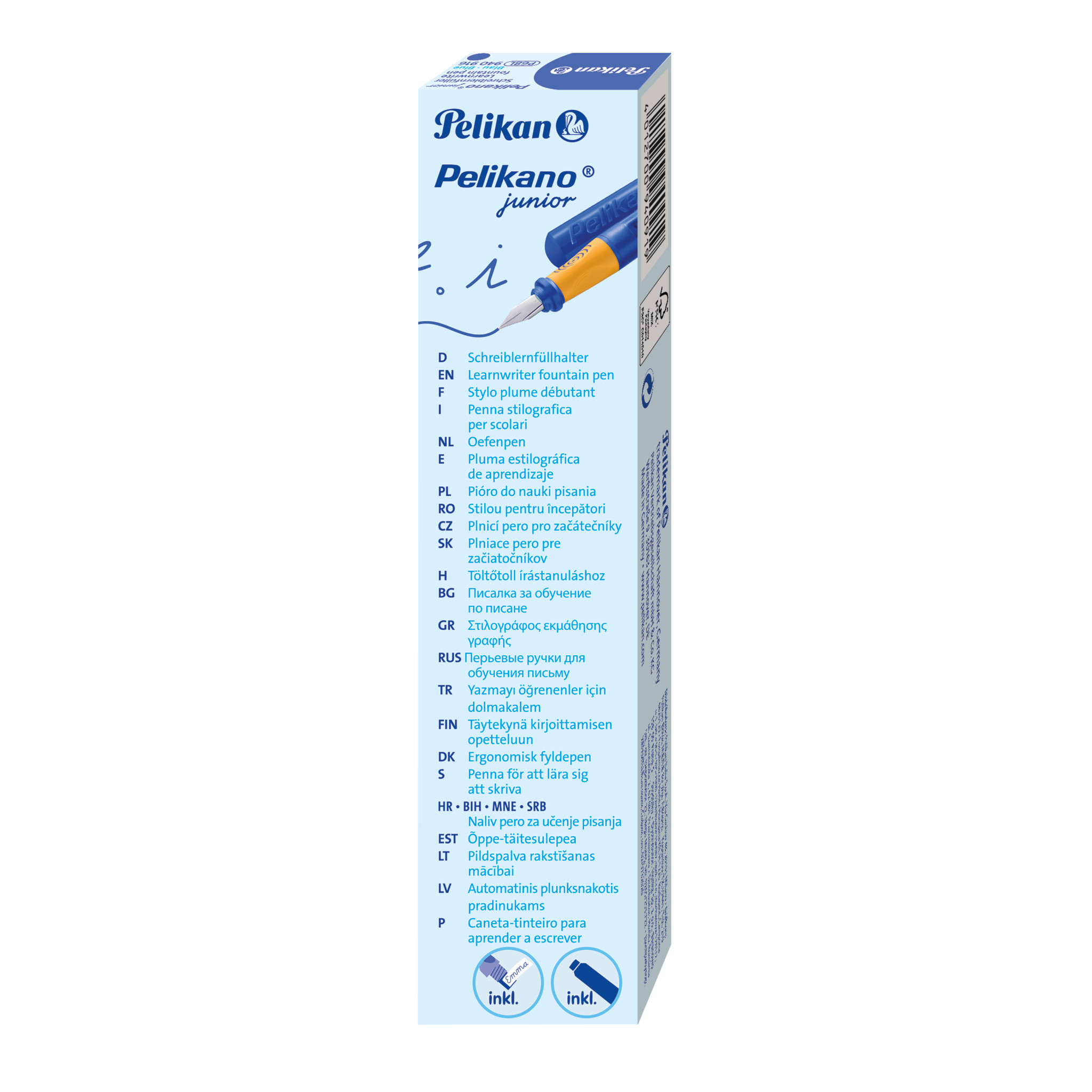 Füller zum Schreibenlernen; Für Linkshänder; Mit Spezial-Griffzone; Abrutschen der Finger auf die Feder wird verhindert; Druckstabile Edelstahlfeder für Schreibanfänger; Wegrollschutz an Kappe und Schaft; Mit großem Tintensichtfenster; Mit Namensfeld für die individuelle Beschriftung; Inklusive einer Großraum-Tintenpatrone; Feder: A; Farbe: Blau; Made in Germany