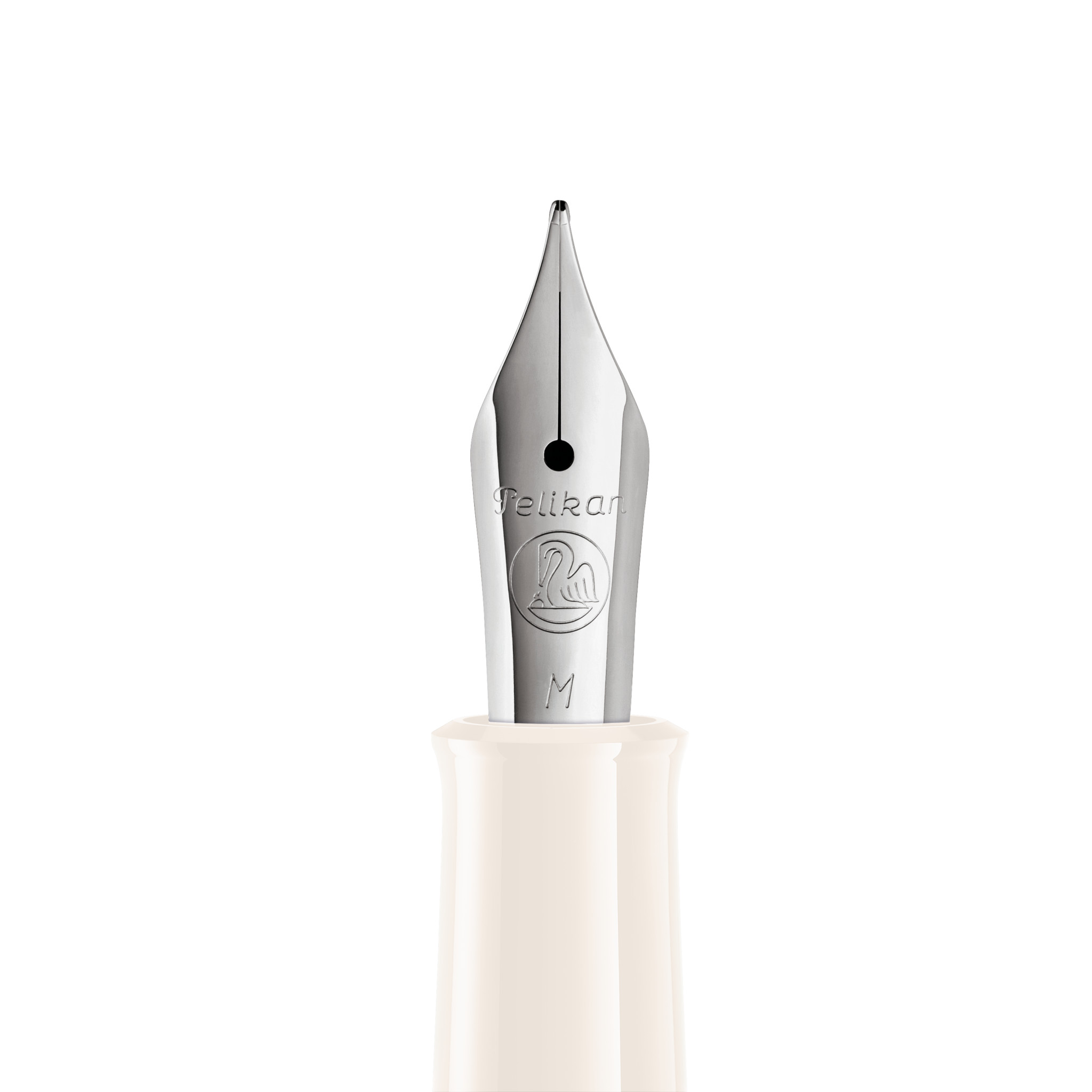 The writing instruments in these series are the epitome of classical writing culture. Featuring a perfect appearance with an unmistakable Pelikan design, they form the elegant writing instruments of our timeless, beautiful Classic series. The white casing material consists of high-gloss, polished high-grade resin. Through the use the material tends to polish itself which gives the writing instrument its long-lasting shine. All highlights, like the traditional beak-like clip and the rings are silver chrome-plated. The fountain pen with piston filling mechanism providesa polished stainless steel nib and is available with the nib sizes EF, F, M or B. The M nib creates a medium typeface and is suitable for handwritings with bigger swings.