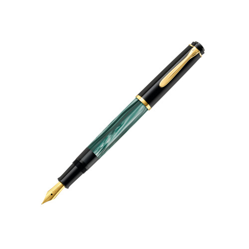The writing instruments in these series are the epitome of classical writing culture. Featuring a perfect appearance with an unmistakable Pelikan design, they form the elegant writing instruments of our timeless, beautiful Classic series. The shimmering custom-marbled material of the casing is different with every writing instrument. All highlights, like the traditional beak-like clip and the rings are 24-carat gold-plated. The fountain pen with piston filling mechanism providesa 24-carat gold-plated stainless steel nib and is available with the nib sizes EF, F, M or B. The B nib creates a brought typeface and is suitable for handwritings with big swings. |