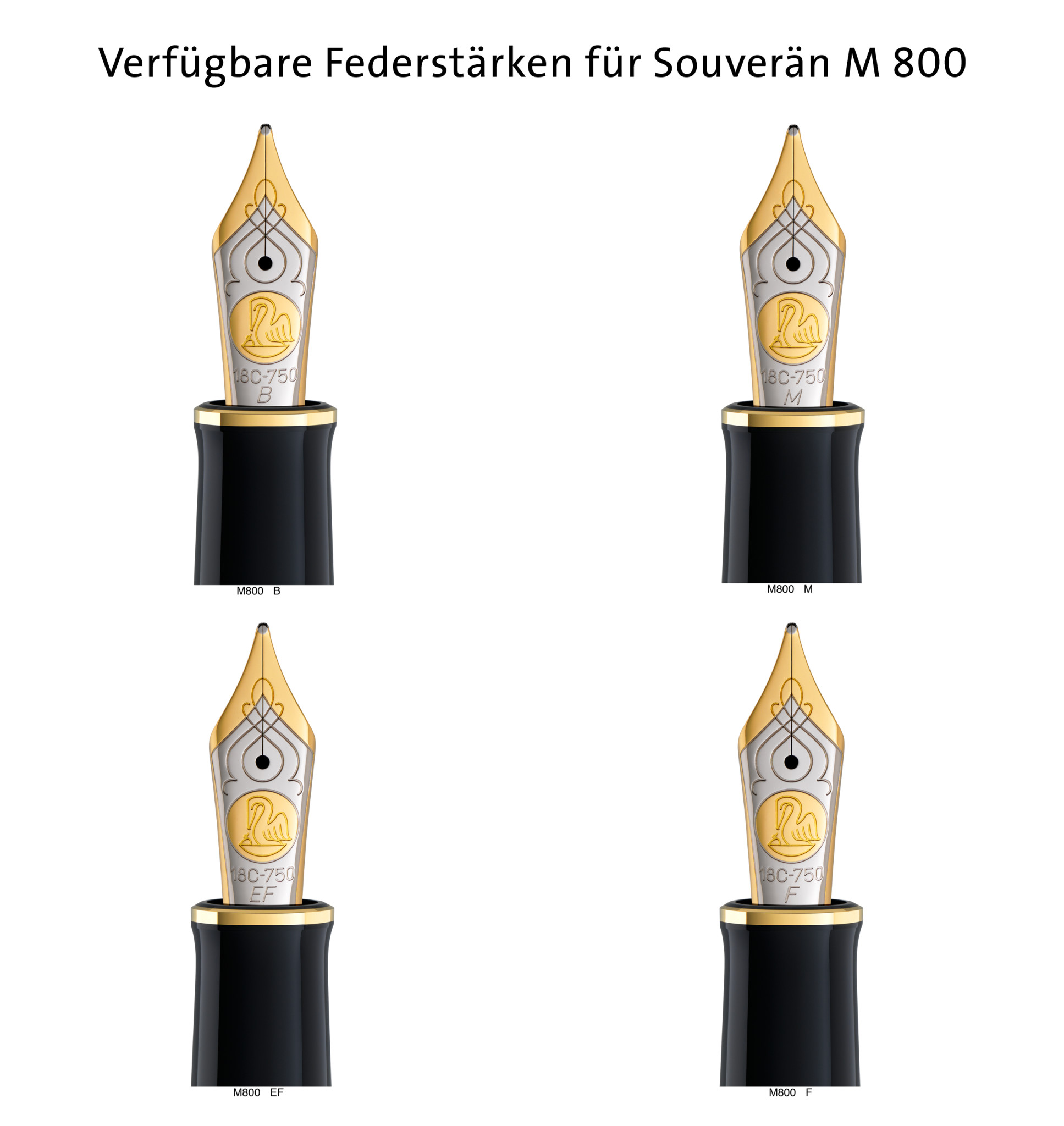 Souverän - A world-famous classic. The deep black casing is subject to an elaborate process. The material of the casing consists of high-grade resin and it takes month until it is finished, whereupon the tailor-made plating is curved and cut into a contour using a natural diamond. The characteristic double rings are then integrated into the cap and barrel with the utmost precision. The writing instrument is then polished until it reaches a brilliant luster. The fountain pen M800 with piston filling mechanism consists of a 14-carat bi-color gold nib with rhodium trim and is available with the nib sizes EF, F, M or B. The M nib creates a medium typeface and is suitable for handwritings with bigger swings.